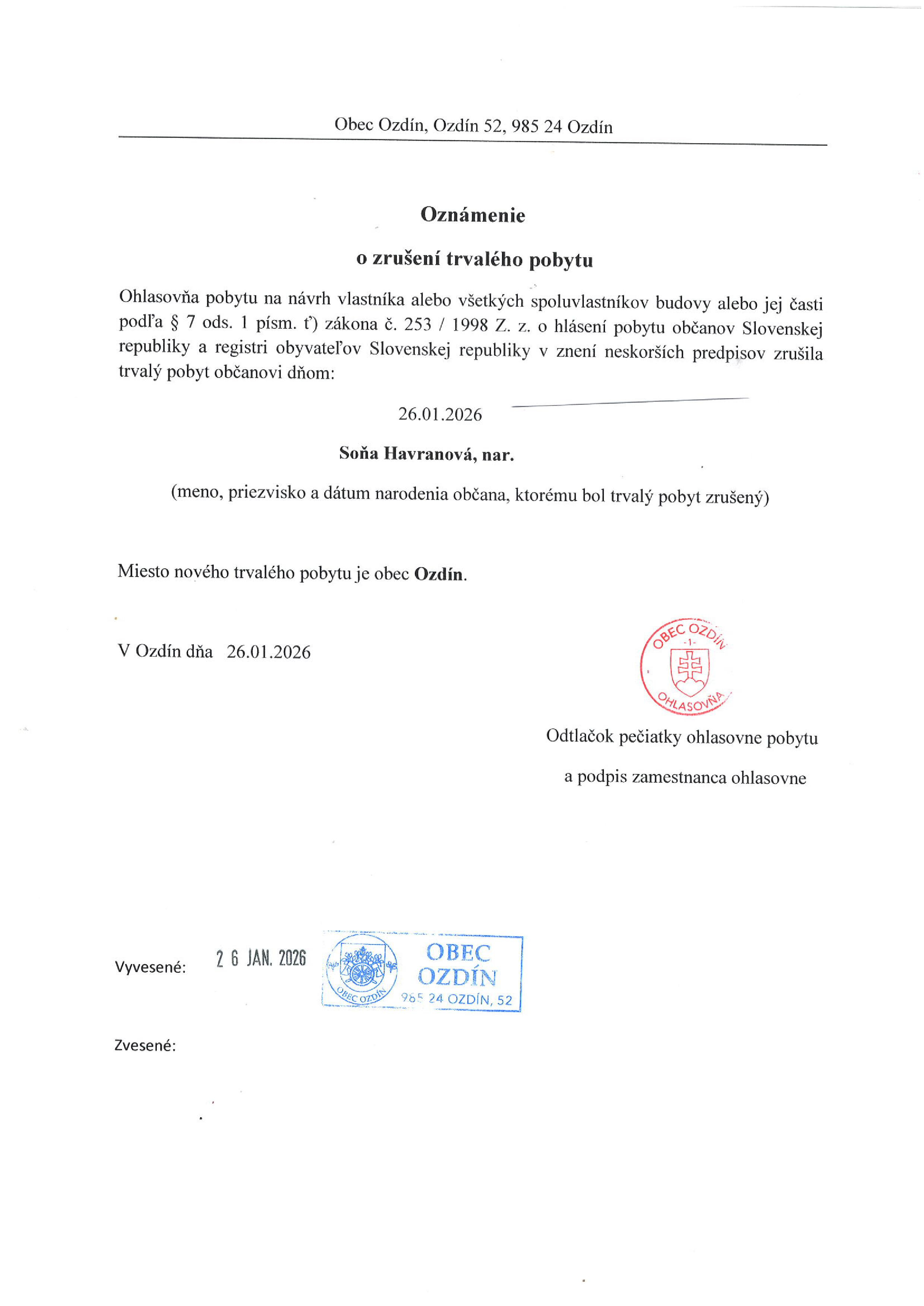 Oznámenie OZ 30.01.2026